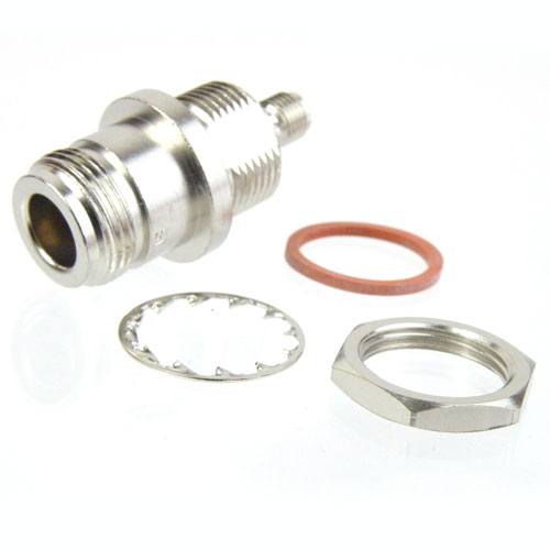 Bulkhead SMA Female (Jack) to N Female (Jack) Adapter, Nickel Plated Brass Body, High Temp, 1.2 VSWR
